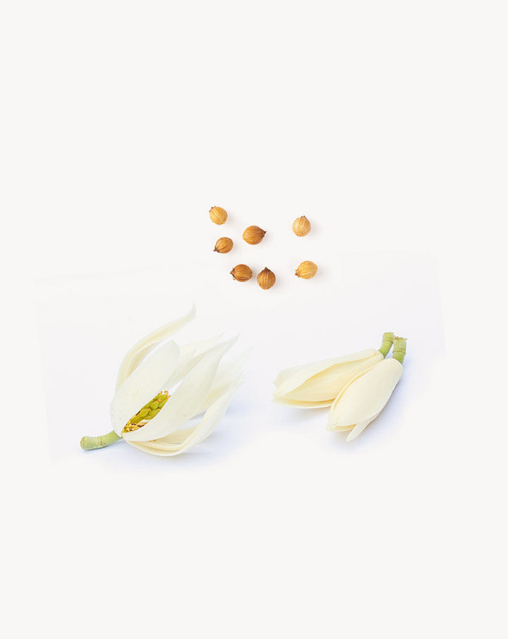 Huile de Cocos Nucifera (Noix de coco), Huile d’écorce d’Amyris Balsamifera, Huile d’écorce d’Abies Balsamea (Baumier du Canada), Huile de graines de Coriandrum Sativum (Coriandre (graines), Huile de fleurs de Michelia Alba, Linalol*, Limonène*